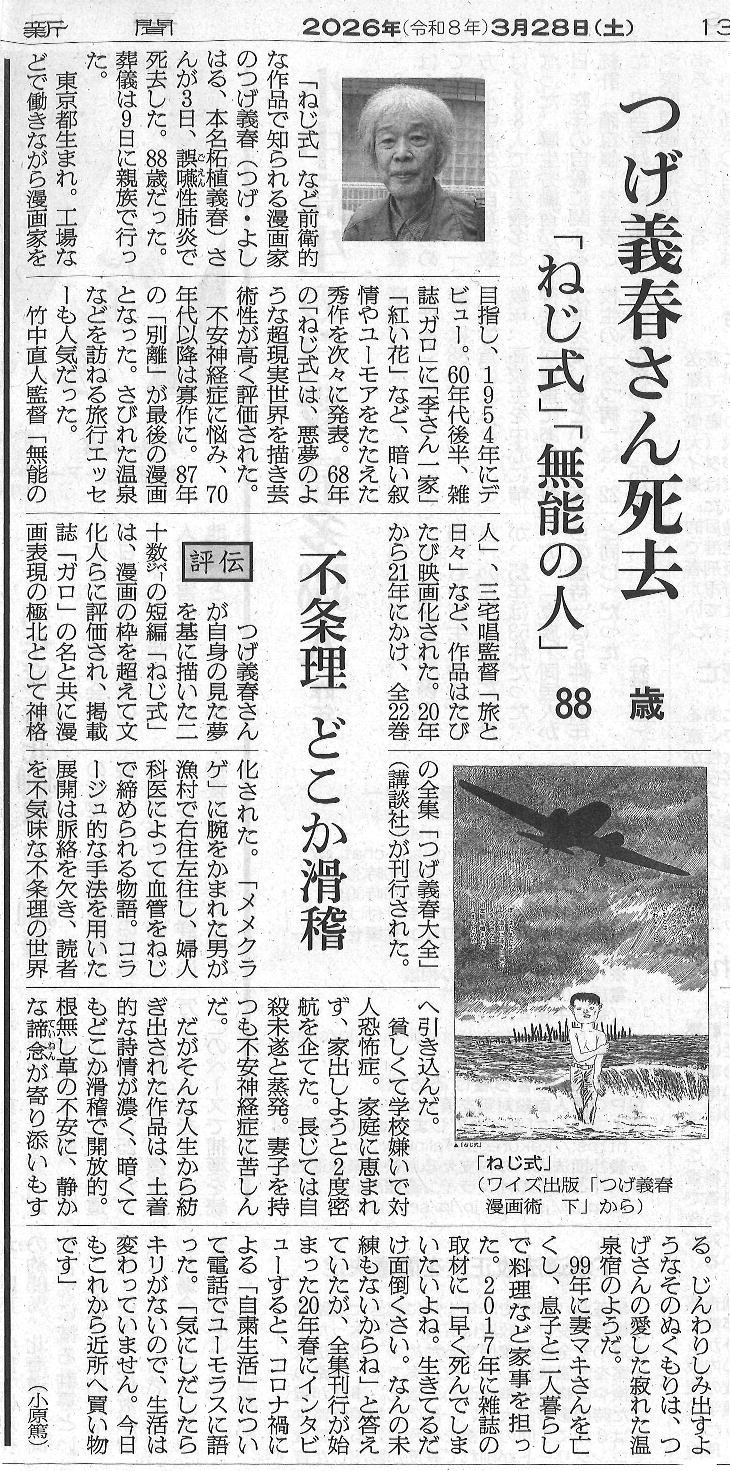 3月27日、孤高の漫画家、つげ義春が3月3日に亡くなったと発表された。私にとって大変影響を受けた人なので、それについて述べていきたい。